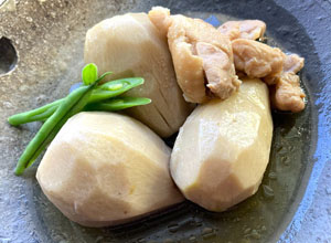 3. を加え10分煮て、一口大に切った鶏肉と淡口醤油を加え、落とし蓋をして鍋蓋をし、弱火で15分程、煮含めます。