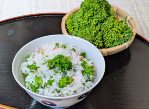 桜海老の色あいと、サッと茹で上げた花菜の緑色のコントラストが美しい混ぜご飯です。