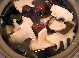 3. 土鍋に昆布・梅干し・京たけのこを入れ、水を4カップほど注いで酒を加えます。